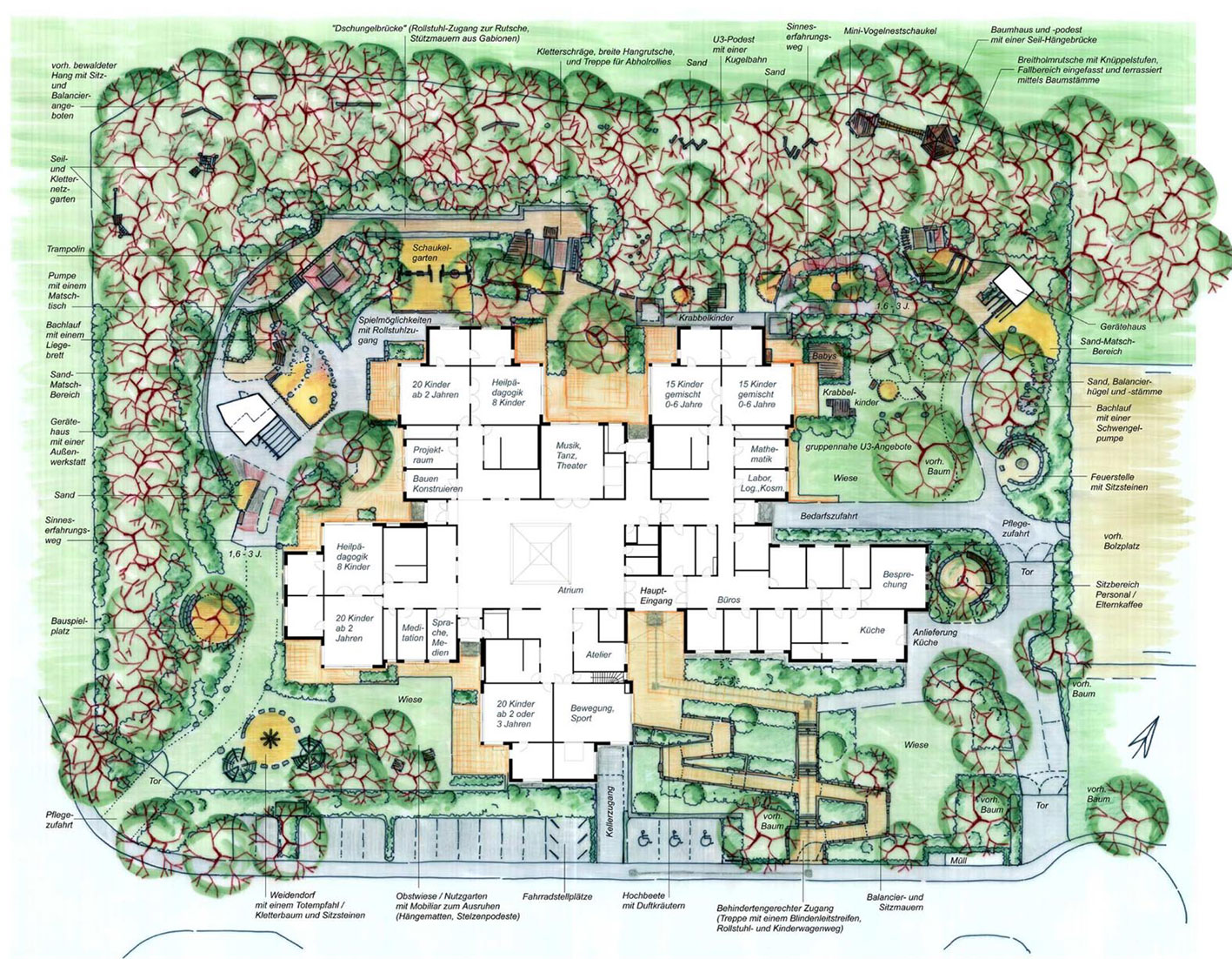 das Gebäude herum vielfältige Spiel-, Bildungs-